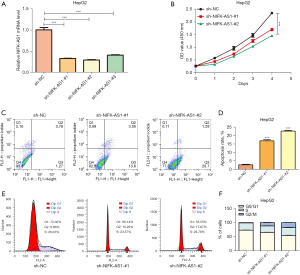 To clarify the biochemical effect of NIFK-AS1 on HCC in terms of the cell cycle, we selected HepG2 with the highest expression of NIFK-AS1 as the model for subsequent experiments. Then NIFK-AS1 was knockdown in HepG2 and the silencing effect was examined by RT-qPCR. As shown in Figure 5A, the messenger RNA (mRNA) expression level of NIFK-AS1 was markedly diminished following transfection with the specific-sh-NIFK-AS1 (P<0.001). In particular, sh-NIFK-AS1-#1 and -#2 were more significantly reduced and were selected for subsequent experiments.