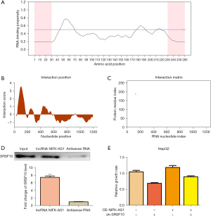 In our study, the cell cycle distribution was determined following transfection of sh-NIFK-AS1 into the HepG2 cell line. Compared with the sh-NC, knockdown of NIFK-AS1 has the ability to inhibit the cell cycle in the G2/M phase and affects cell cycle progression. Consistent with previous studies, our results illustrate that NIFK-AS1 is a lncRNA that promotes cancer progression. We confirmed the lncRNA NIFK-AS1/SRSF10 interaction through the catRAPIDomics module and RNA pull-down analysis and found that the overexpression of NIFK-AS1 is sufficient to save the growth of HepG2 cells knocked down by SRSF10. These results indicate that the treatment of SRSF10 knockdown cells with NIFK-AS1 overexpression partially rescued the growth of HepG2 cells.