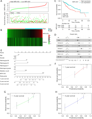 Next, we combined these factors with NIFK-AS1 expression for multivariate Cox analysis (Figure 2D). The nomogram indicated that the expression level of NIFK-AS1 significantly impacted the progress and diagnosis of HCC patients, which were second only to pathological T (Figure 2E). Survival analysis of the combined effect showed that combining NIFK-AS1 with clinical parameters could increase the accuracy and possibility of a successful prognostic prediction. The calibration chart showed that the resulting nomogram performed well (Figure 2F-2H).