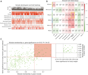 We drew scatter plots of Gene Significance (GS) vs. Module Membership (MM) in the green module with altered genome fractions of HCC patients (correlation =0.52, P=1.3e-22), elaborating that 40 lncRNAs were the genes under the condition of MM >0.60 and GS <0.20 (Figure 1B,1C).