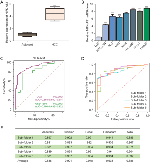 Next, we performed a ROC curve analysis to calculate and assess the sensitivity and specificity of NIFK-AS1 in the diagnosis of HCC. NIFK-AS1 is a favorable indicator for diagnosing HCC in TCGA data, and its AUC value is 0.885 (Figure 3C). To verify the diagnostic significance of NIFK-AS1, we selected the GSE41804 dataset, which included 20 HCC patients and 20 healthy individuals (Figure 3C). Subsequently, we modeled the logistic regression to further evaluate the diagnostic effectiveness of NIFK-AS1 for HCC (Figure 3D). After constructing the confusion matrix, the average values of accuracy, accuracy, recall, F measurement, and AUC were 0.886, 0.901, 0.978, 0.938, and 0.885, respectively (Figure 3E). These results indicate that NIFK-AS1 exhibits good performance and can distinguish HCC samples from normal controls.