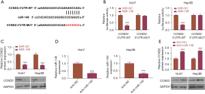 StarBase v2.0 (https://bio.tools/starbase) was used to find downstream targets of miR-149 in HCC, and we discovered a potential miR-149 binding site in the 3' UTR of CCND2 (Figure 5A). The luciferase assay revealed that overexpression of miR-149 inhibited the luciferase activity of the WT CCND2 reporter, but not after the binding site was mutated (Figure 5B). The expression of CCND2 was reduced in miR-149 overexpressing cells compared to that in cells transfected with mimics NC (Figure 5C). The miR-149 was knocked down by transfection of miR-149 inhibitor in Huh7 and Hep3B cells (Figure 5D), and the expression of CCND2 was elevated by knockdown of miR-149 (Figure 5E). Taken together, miR-149 targeted CCND2 to suppress its expression in HCC cells.