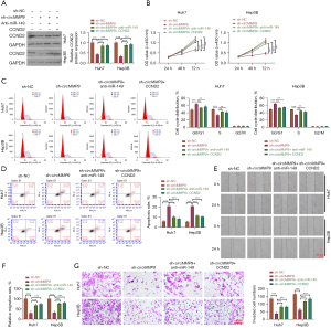 To investigate whether knockdown of circMMP9-mediated alleviation of HCC progression was dependent on the miR-149/CCND2 axis, Huh7 and Hep3B cells were transfected with sh-circMMP9 and an inhibitor of miR-149 or the CCND2 overexpressing vector. The expression of CCND2 was decreased in Huh7 and Hep3B cells with knockdown of circMMP9, but it was reversed by concomitant suppression of miR-149 or overexpression of CCND2 (Figure 6A). Knockdown of circMMP9-mediated inhibition of HCC cell proliferation was abrogated by silencing of miR-149 or overexpression of CCND2 (Figure 6B). Additionally, knockdown of circMMP9-induced cell cycle arrest and apoptosis were reversed by concomitant suppression of miR-149 or overexpression of CCND2 in Huh7 and Hep3B cells (Figure 6C,6D). Both cell migration and invasion of HCC were mitigated by knockdown of circMMP9, which was abolished by concomitant suppression of miR-149 or overexpression of CCND2 (Figure 6E-6G). These data indicated that knockdown of circMMP9 attenuated HCC progression through the miR-149/CCND2 axis.