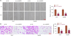 Wound healing and transwell assays were performed to study whether knockdown of circMMP9 affects HCC cell migration and invasion. Cell migration was notably reduced in cells with knockdown of circMMP9 compared to that of cells transfected with sh-NC (Figure 3A). Furthermore, cells with knockdown of circMMP9 exhibited lower invasive capacity than control cells (Figure 3B). Collectively, knockdown of circMMP9 suppressed HCC cell migration and invasion.