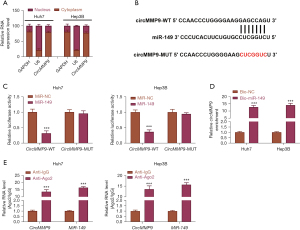 The Huh7 and Hep3B cells were lysed, and supernatants were harvested after centrifugation. An Ago-2 antibody or normal IgG isotype was coated on magnetic beads and added into supernatants. Samples were incubated with gentle rotation overnight. The RNA was recovered using TRIzolTM LS Reagent (Thermo Fisher), and the enrichment of circMMP9 and miR-149 were examined by qRT-PCR.