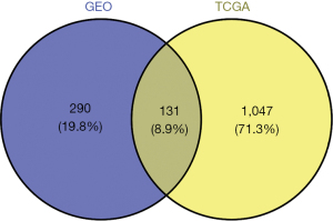 We used the R limma package (version 3.10.3; http://www.bioconductor.org/packages/2.9/bioc/html/limma.html) to screen for DEGs between the tumor and control samples (11). The P value was calculated and adjusted using the Benjamini-Hochberg method (12). The thresholds of an adjusted P value <0.05 and a |log2 fold change (FC)| >1 were set as the screening criteria for DEG identification. Additionally, a Venn analysis was conducted to extract the intersection DEGs between the GSE54129 and GSE79973 data sets. These DEGs were regarded as the candidate targets and used in the following analysis.