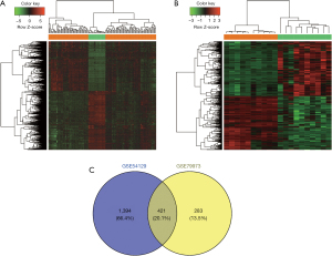 A total of 1,815 (830 upregulated and 985 downregulated) DEGs were screened between the GC and normal tissues in GSE54129. There were 704 (356 upregulated and 348 downregulated) DEGs in the GSE79973 data set. Additionally, the hierarchical clustering analyses revealed that the DEGs in the GSE54129 (see Figure 1A) and GSE79973 (see Figure 1B) data sets could significantly discriminate between the GC and normal samples. We further extracted 421 intersection DEGs between these 2 data sets by a Venn analysis (see Figure 1C).