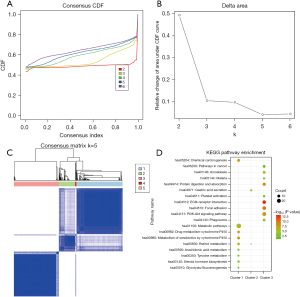 We carried out a clustering analysis of the intersection DEGs to identify the gene sets with a similar function. The Consensus Cluster Plus algorithm was used for the gene clustering analysis, and the CDF was calculated to determine the optimal cluster number. From the CDF curve and CDF delta area curve, we found that k=5 represented the most stable clustering outcome (Figure 2A,2B). Thus, these intersection DEGs were grouped into 5 clusters (see Figure 2C). Our results also showed that there were 178 genes in cluster 1, 63 in cluster 2, 174 in cluster 3, 5 in cluster 4, and 1 in cluster 5. Subsequently, we conducted functional analyses of the genes in the 5 clusters. We found that the genes in clusters 1 and 3 were all significantly enriched in 9 KEGG pathways (see Figure 2D). For example, the genes in cluster 1 mainly participated in the xenobiotics metabolism by cytochrome P450 and chemical carcinogenesis pathways. The genes in cluster 3 were primarily associated with the extracellular matrix (ECM)-receptor interaction and focal adhesion pathways. The genes in cluster 2 were strongly related to the gastric acid secretion and retinol metabolism pathways. The genes in clusters 4 and 5 were not enriched in any pathway.