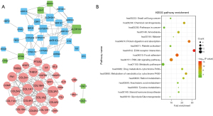 The PPI network based on the intersection DEGs was constructed. It contained 58 nodes and 211 interaction pairs. Notably, there were 22 genes in cluster 1, 7 in cluster 2, and 29 in cluster 3 (see Figure 3A). Further, there were 36 hub genes with a degree ≥5 (see Table 1). Additionally, we performed a KEGG enrichment analysis for these hub genes. The results suggested that they were predominantly enriched in 18 KEGG pathways, such as the ECM-receptor interaction and focal adhesion pathways (see Figure 3B).