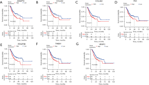 To further study the association between the hub genes and the OS of GC patients, survival analyses for all the genes in the 5 clusters were carried out. The results suggested that 66 genes were significantly correlated with the clinical outcomes of GC patients. Subsequently, the 7 overlapping genes between the prognosis-related genes and hub genes in the PPI network were extracted. They included angiopoietin 2 (ANGPT2) (see Figure 4A), collagen type IV alpha 1 chain (COL4A1) (see Figure 4B), collagen type IV alpha 2 chain (COL4A2) (see Figure 4C), fibronectin 1 (FN1) (see Figure 4D), platelet-derived growth factor receptor beta (PDGFRB) (see Figure 4E), thrombospondin 1 (THBS1) (see Figure 4F), and vascular endothelial growth factor C (VEGFC) (see Figure 4G). These genes were all upregulated, and their high expression levels were associated with a poor prognosis.