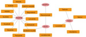 The correlations between the 7 prognosis-associated genes and drugs were predicted using the DGIdb database. There were 20 drug-gene interaction pairs, including 4 upregulated genes (i.e., PDGFRB, ANGPT2, VEGFC, and THBS1) and 18 drugs (see Figure 5).