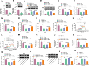 GNG7 protein expression was knocked down by si-GNG7 in AGS and HGC-27 cells, in contrast to the si-NC group (Figure 6A,6B). In addition, si-GNG7 attenuated the promoting effect of in-miR-425-3p on GNG7 protein levels (Figure 6C,6D). The EdU assay (Figure 6E,6F) and colony formation assay (Figure 6G,6H) demonstrated that miR-425-3p inhibitor reduced cell proliferation, which was partially abrogated by si-GNG7. The tube formation assay revealed that in-miR-425-3p-induced suppression of angiogenesis was restored after knockdown of GNG7 (Figure 6I,6J). Downregulation of miR-425-3p inhibited ECAR (Figure 6K,6L), glucose consumption (Figure 6M,6N), lactate production (Figure 6O,6P), and HK2 protein levels (Figure 6Q,6R) by elevating the expression of GNG7 in AGS and HGC-27 cells. Flow cytometry demonstrated that silencing GNG7 decreased the apoptosis promotion caused by in-miR-425-3p (Figure 6S,6T). Thus, miR-425-3p regulated GC progression by targeting GNG7.
