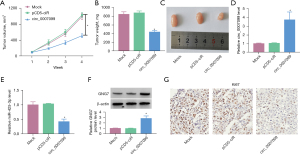 The xenograft tumor assay in mice showed that tumor volume (Figure 8A) and weight (Figure 8B) were significantly inhibited in the circ_0007099 group relative to the pCD5-ciR and mock groups. The tumor images are shown in Figure 8C. Circ_0007099 levels were enhanced in the tumor tissues of the circ_0007099 group in contrast to the mock and pCD5-ciR groups (Figure 8D). Overexpression of circ_0007099 induced miR-425-3p downregulation (Figure 8E) and GNG7 protein upregulation (Figure 8F) in tumor tissues. The IHC assay indicated that Ki67 protein expression in mice was reduced by circ_0007099 (Figure 8G). In summary, circ_0007099 inhibited tumorigenesis in vivo by targeting the miR-425-3p/GNG7 axis.
