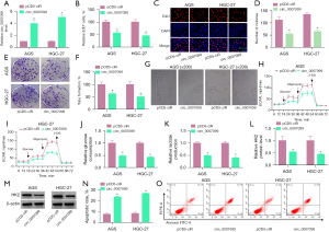 The biological function of circ_0007099 was analyzed after transfection of pCD5-ciR or circ_0007099. The RT-qPCR results indicated that circ_0007099 levels were increased by about 4-fold in circ_0007099-transfected cells relative to pCD5-ciR-transfected cells (Figure 2A). EdU+ cells in the EdU assay (Figure 2B,2C) and cell colonies in the colony formation assay (Figure 2D,2E) demonstrated that the cell proliferation ability of the circ_0007099 group was repressed compared with the pCD5-ciR group. The tube formation assay showed that angiogenesis was suppressed by overexpression of circ_0007099 in the AGS and HGC-27 cells (Figure 2F,2G). The upregulation of circ_0007099 resulted in inhibitory effects on ECAR (Figure 2H,2I), glucose consumption (Figure 2J), and lactate production (Figure 2K), which suggested that circ_0007099 blocked glucose metabolism in GC cells. Moreover, HK2 protein expression was downregulated by circ_0007099 transfection in the AGS and HGC-27 cells (Figure 2L,2M). After circ_0007099 was overexpressed, flow cytometry revealed that the apoptotic rate was significantly elevated (Figure 2N,2O). The above evidence identified that circ_0007099 impeded cell development in GC.