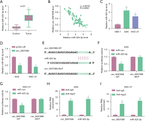 Compared with the control groups, miR-425-3p was highly expressed in GC tissues (Figure 3A), and circ_0007099 exhibited a negative relation (r=−0.8319, P<0.0001) with miR-425-3p in 57 GC samples (Figure 3B). RT-qPCR also indicated that miR-425-3p levels were higher in AGS and HGC-27 cells than in GES-1 cells (Figure 3C). More interestingly, miR-425-3p expression was downregulated by circ_0007099 overexpression in AGS and HGC-27 cells (Figure 3D). The binding sites between the circ_0007099 and miR-425-3p sequences were revealed by Targetscan website, as shown in Figure 3E. The dual-luciferase reporter assay demonstrated that miR-425-3p upregulation induced luciferase signal inhibition of the circ_0007099-WT group but not the circ_0007099-MUT group in AGS and HGC-27 cells (Figure 3F,3G). In addition, high levels of circ_0007099 and miR-425-3p were found in the anti-Ago2 group relative to the anti-IgG group in the RIP assay (Figure 3H,3I). Therefore, circ_0007099 served as a miR-425-3p sponge.