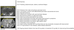 A 36-year-old white man presented to a gastroenterology clinic with one year of progressive diarrhea, up to ten times per day. A timeline of the case is shown in Figure 1. Presenting symptoms included diaphoresis, gastroesophageal reflux disease (GERD)-like epigastric pain, exertional dyspnea, and lower extremity edema. He had a medical history of hypertension, hyperlipidemia, obesity, and hepatic steatosis, and at presentation was taking rosuvastatin and lisinopril. He had a family history of a father with colorectal cancer in his fifties and a grandmother with breast cancer at a young age in her twenties, but denied a family history of multiple endocrine neoplasia (MEN), which encompasses several genetic syndromes with endocrine tumors, including PaNETs. He previously smoked and drank on occasion and worked in an office. Endoscopy revealed H. pylori and microscopic colitis, with symptoms that failed to improve with treatment. Computerized tomography (CT) imaging revealed extensive liver metastases up to 7 cm and a primary pancreatic tail lesion. Liver biopsy demonstrated well-differentiated NET G3 with 1 mitosis per 2 mm2 and Ki-67 of 40%.