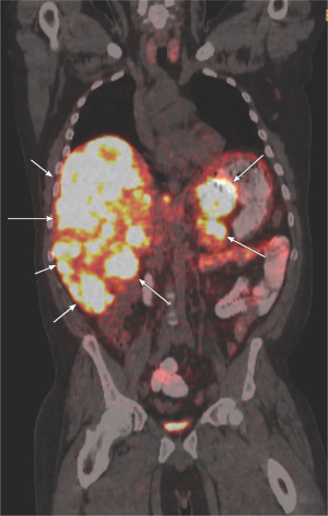 The patient subsequently presented to medical oncology clinic at our center, where examination was notable for right heart failure with jugular venous distension, a murmur of tricuspid regurgitation, and lower extremity edema; carcinoid syndrome with tachycardia, hypertension, and diaphoresis; and liver metastasis with extensive hepatomegaly. Labs were notable for an elevated serum Chromogranin A 1,430 ng/mL, serotonin 2,640 ng/mL, and random urine 5-HIAA 684 mg/g creatinine. Gallium DOTATE positron emission tomography (PET) demonstrated avid pancreatic tail primary and bulky, bilobar liver metastases with abdominal lymphadenopathy (Figure 2). These findings were consistent with a well-differentiated serotonin-producing PaNET G3, metastatic to liver and lymph nodes. Somatic tumor sequencing with the Memorial Sloan Kettering-Integrated Mutation Profiling of Actionable Cancer Targets (MSK-IMPACT) next-generation sequencing (NGS) for 505 genes revealed a microsatellite stable tumor with low tumor mutation burden (0.8 mutations per megabase) and mutations in ARID1A, CHEK2, NF1, and PIK3CA, which have been reported in well-differentiated NETs (7,8). Germline NGS for 90 genes was negative, including for MEN1. Additional lab tests were notable for an elevated N-terminal prohormone of brain natriuretic peptide (NT-proBNP) of 585 pg/mL. Echocardiogram demonstrated severe tricuspid regurgitation and moderate pulmonic insufficiency consistent with right heart involvement, all typical of CHD. Although the patient had a normal ejection fraction of 62%, mild aortic regurgitation and dyspnea on exertion raised concern for early left heart involvement, which is unusual for CHD. This was further suspected after echo with bubble demonstrated a right to left shunt, although he did not have evidence of left sided valve involvement. Right to left shunts enable vasoactive hormones, normally inactivated in the pulmonary vasculature, to transit to the left heart and induce dysfunction. Valve replacement was deferred in favor of medical heart failure management to first control his underlying NET and reduce risk of prosthetic valve failure from elevated hormones.
