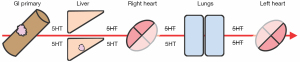 CHD was first described 1954 (17). Of the half of all patients with well-differentiated NETs who develop carcinoid syndrome, twenty to seventy percent will go on to develop CHD (18). Tricuspid regurgitation and right heart failure are classic features in CHD (1,5). Mechanistically, vasoactive hormones induce proliferation of myofibroblasts, smooth muscle cells, and extracellular matrix, leading to formation of valvular and sub-valvular plaques on the tricuspid and pulmonic valves (1). CHD only develops in patients with metastatic disease because serotonin is inactivated in the liver. Hormones from liver metastases bypass hepatic inactivation. Similarly, inactivation of serotonin in the pulmonary vasculature protects the left heart from dysfunction, except in patients with cardiac shunts or high hormone levels (Figure 3) (1).